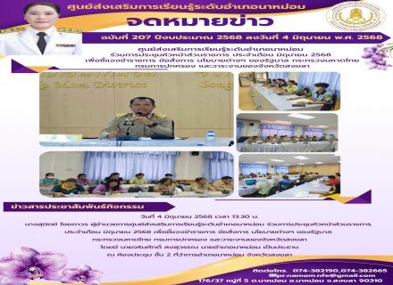 ศูนย์ส่งเสริมการเรียนรู้ระดับอำเภอนาหม่อม ร่วมการประชุมหัวหน้าส่วนราชการ ประจำเดือน มิถุนายน 2568 เพื่อชี้แจงข้าราชการ ข้อสั่งการ นโยบายต่างๆ ของรัฐบาล กระทรวงมหาดไทย กรมการปกครอง และวาระงานของจังหวัดสงขลา