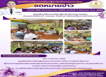 วันที่ 4 มิถุนายน 2568 ศูนย์ส่งเสริมการเรียนรู้ระดับอำเภอนาหม่อม นำโดย นางสุนิตย์ ไชยถาวร ผู้อำนวยการศูนย์ส่งเสริมการเรียนรู้ระดับอำเภอนาหม่อม พร้อมด้วยครูและบุคลากร ประชุมรายสัปดาห์ วางแผน ติดตามการขับเคลื่อนการดำเนินงาน ณ ศูนย์ส่งเสริมการเรีย