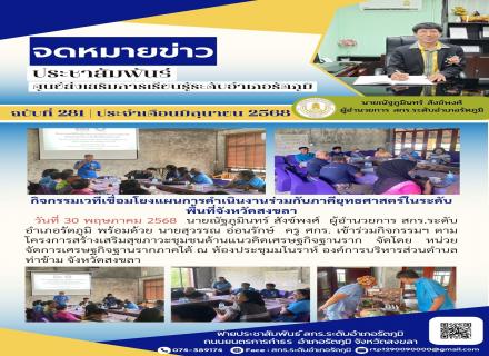 วันที่ 30 พฤษภาคม 2568 นายณัฐภูมินทร์ สังข์พงศ์ ผู้อำนวยการ สกร.ระดับอำเภอรัตภูมิ มอบหมายให้ นางถนอมพร อารมณ์เย็น ตำแหน่ง ครูชำนาญการ พบกลุ่มนักศึกษา กลุ่มห้องสมุดประชาชน ณ สกร.ระดับ อ.รัตภูมิ จ.สงขลา |
