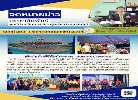 วันที่ 30 พฤษภาคม 2568 นายณัฐภูมินทร์ สังข์พงศ์ ผู้อำนวยการ สกร.ระดับอำเภอรัตภูมิ มอบหมายให้ นางสาวสิริมนต์ สุนทราภรณ์ ครูศกร.ระดับตำบลท่าชะมวง เข้าร่วมในพิธีเปิดโครงการ \"อบต.พบประชาชน\" ประธานในพิธีเปิดโดย นายอารีย์ สนหล๊ะ นายกองค์การบริหาร |