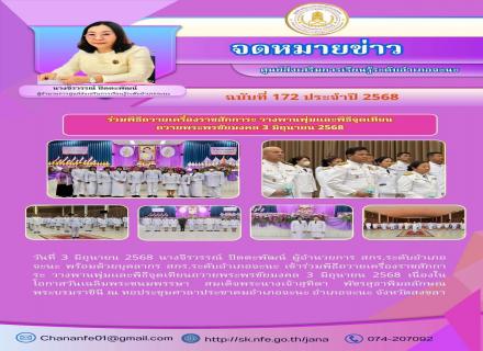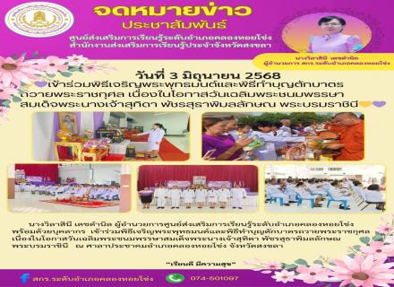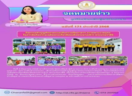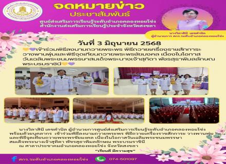 วันที่ 3 มิถุนายน 2568 นางจีรวรรณ์ ปัตตะพัฒน์ ผู้อำนวยการศูนย์ส่งเสริมการเรียนรู้ระดับอำเภอจะนะ มอบหมายให้บุคลากร สกร.ระดับอำเภอจะนะ เข้าร่วมกิจกรรมทำบุญตักบาตรถวายพระราชกุศล กิจกรรมเฉลิมพระเกียรติ 3 มิถุนายน 2568 เนื่องในโอกาสวันเฉลิมพระชนมพรรษา สมเด็จพ |
