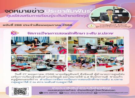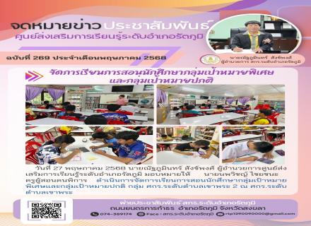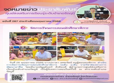 วันที่ 26 พฤษภาคม 2568 นางปภาดา เตชะรัตน์ ครูผู้สอนคนพิการ ดำเนินการจัดการเรียนการสอนนักศึกษาพิการ ระดับ ม.ต้น รายวิชาช่องทางการพัฒนาอาชีพ โดยมีนายณัฐภูมินทร์ สังข์พงศ์ ผู้อำนวยการศูนย์ส่งเสริมการเรียนรู้ระดับอำเภอรัตภูมิ เป็นผู้นิเทศการสอนในครั้งนี้ ณ ส |