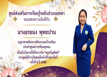 ศูนย์ส่งเสริมการเรียนรู้ระดับอำเภอเทพาขอแสดงความยินดีกับนางอรอนง พุทธปาน ตำแหน่งครูอาสาสมัครการศึกษานอกโรงเรียน ประจำศูนย์การเรียนชุมชน ที่ได้รับรางวัล ครูขวัญศิษย์ จากมูลนิธิรางวัลสมเด็จเจ้าฟ้ามหาจักรี ครั้งที่6 ปี 2568 |