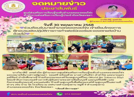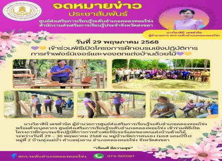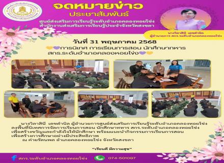 วันที่ 30 พฤษภาคม 2568 นางจีรวรรณ์ ปัตตะพัฒน์ ผู้อำนวยการศูนย์ส่งเสริมการเรียนรู้ระดับอำเภอจะนะ มอบหมายให้ครูศูนย์การเรียนรู้ระดับตำบลแค ดำเนินการจัดกิจกรรมการศึกษาต่อเนื่อง โครงการศูนย์ฝึกอาชีพชุมชน กิจกรรมอาชีพระยะสั้นกลุ่มสนใจ จำนวน 3 ชั่วโมง หลักสูตรข |