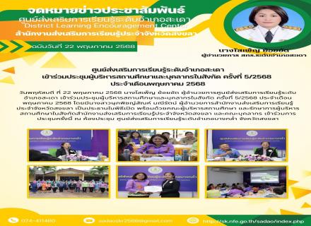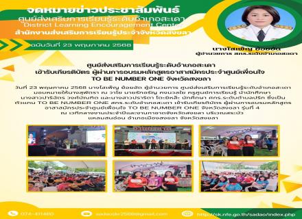 วันที่ 23 พฤษภาคม 2568 นางโสเพ็ญ ย้อยอัด ผู้อำนวยการศูนย์ระดับอำเภอสะเดา และนางสาวฮาหวา ปอทอง ครูศูนย์การเรียนรู้ เป็นตัวแทนคณะครูและบุคลากร มอบเงินสบทบทุน งานสถาปนาโรงเรียนเพื่อระดมทุนการศึกษา เพื่อซ่อมแซมอาคารบานบุรี(อาคารหลังแรกของโรงเรียน) ณ อาคารเอน |