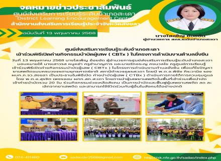 วันที่ 28 พฤษภาคม 2568 นางจีรวรรณ์ ปัตตะพัฒน์ ผู้อำนวยการ สกร.ระดับอำเภอจะนะ มอบหมายให้ครูศูนย์การเรียนรู้ระดับตำบลบ้านนาดำเนินการกิจกรรมการพบกลุ่มนักศึกษา ศกร.ระดับตำบลบ้านนา ประจำภาคเรียนที1/2568 ครั้งที่ 3 รายวิชาศิลปศึกษาทั้งนี้ได้สอดแทรกการดูแลกา |