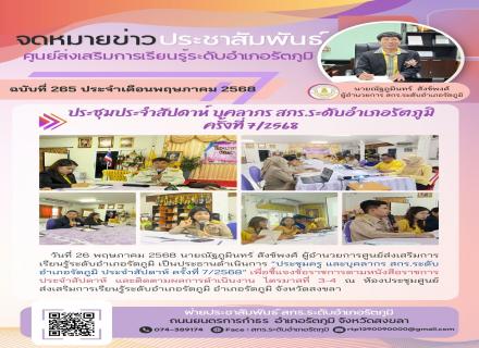 วันที่ 26 พฤษภาคม 2568 นายณัฐภูมินทร์ สังข์พงศ์ ผู้อำนวยการศูนย์ส่งเสริมการเรียนรู้ระดับอำเภอรัตภูมิ เป็นประธานดำเนินการ ประชุมครู และบุคลากร สกร.ระดับอำเภอรัตภูมิ ประจำสัปดาห์ ครั้งที่ 7/2568 เพื่อชี้แจงข้อราชการตามหนังสือราชการประจำสัปดาห์ และติดตามผล |