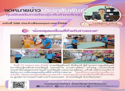 วันที่ 23 พฤษภาคม 2568 นายณัฐภูมินทร์ สังข์พงศ์ ผู้อำนวยการศูนย์ส่งเสริมการเียนรู้ระดับอำเภอรัตภูมิ มอบหมาย นางสาวลัดดา แก้วหนู บรรณารักษ์ ประจำห้องสมุดประชาชนอำเภอรัตภูมิ และนายเฉลิมพร แก้วดี พนักงานบริการ จัดโครงการห้องสมุดเคลื่อนที่สำหรับชาวตลาด โดยมีก |