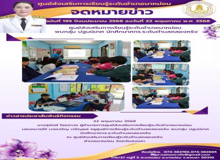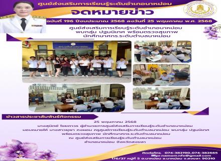 วันที่ 22 พฤษภาคม 2568 นางจีรวรรณ์ ปัตตะพัฒน์ ผู้อำนวยการ สกร.ระดับอำเภอจะนะ มอบหมายให้ครูศูนย์การเรียนรู้ระดับตำบลนาหว้า ดำเนินการกิจกรรมการพบกลุ่มและปฐมนิเทศนักศึกษา ศกร.ระดับตำบลนาหว้า ประจำภาคเรียนที1/2568 ซึ่งได้ชี้แจงโครงสร้างหลักสูตร การสอบ |
