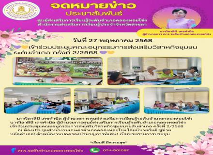 วันที่ 27 พฤษภาคม 2568 นางวิลาสินี เดชดำนิล ผู้อำนวยการศูนย์ส่งเสริมการเรียนรู้ระดับอำเภอคลองหอยโข่ง เข้าร่วมประชุมคณะอนุกรรมการส่งเสริมวิสาหกิจชุมชนระดับอำเภอ ครั้งที่ 2/2568 ณ ห้องประชุมสำนักงานเกษตรอำเภอคลองหอยโข่ง โดยมีนายธีมดี ชูช่วย ปลัดอำเ |