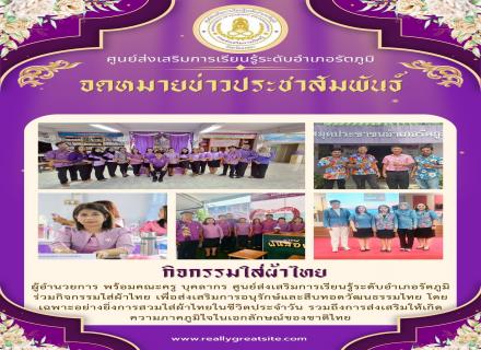 ผู้อำนวยการ พร้อมคณะครู บุคลากร ศูนย์ส่งเสริมการเรียนรู้ระดับอำเภอรัตภูมิ ร่วมกิจกรรมใส่ผ้าไทย เพื่อส่งเสริมการอนุรักษ์และสืบทอดวัฒนธรรมไทย โดยเฉพาะอย่างยิ่งการสวมใส่ผ้าไทยในชีวิตประจำวัน รวมถึงการส่งเสริมให้เกิดความภาคภูมิใจในเอกลักษณ์ของชาติไทย |