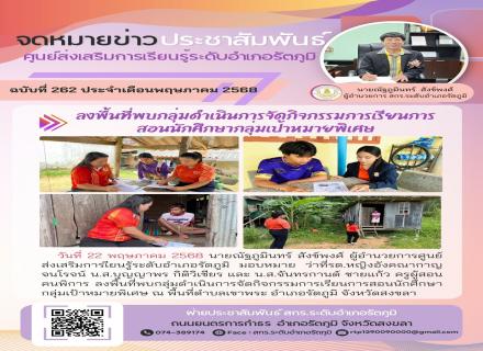 วันพฤหัสบดีที่ 22 พฤษภาคม 2568 ดร.ไพโรจน์ คเชนทองสุวรรณ์ ผู้อำนวยการศูนย์ส่งเสริมการเรียนรู้ระดับอำเภอหาดใหญ่ ได้มอบหมายให้ นายสุภัทรพล พันธุรัตน์ ครูกลุ่มเป้าหมายพิเศษ จัดการเรียนการสอนสำหรับกลุ่มเป้าหมายพิเศษ ณ ชุมชนตลาดใหม่ เพื่อส่งเสริมโอกาสทางการศึกษ |