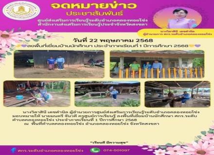 วันที่ 22 พฤษภาคม 2568 นางวิลาสินี เดชดำนิล ผู้อำนวยการศูนย์ส่งเสริมการเรียนรู้ระดับอำเภอคลองหอยโข่ง มอบหมายให้ นายมนตรี จันวดี ครูศูนย์การเรียนรู้ ลงพื้นที่เยี่ยมบ้านนักศึกษา ศกร.ระดับตำบลคลองหอยโข่ง ประจำภาคเรียนที่ 1 ปีการศึกษา 2568 |