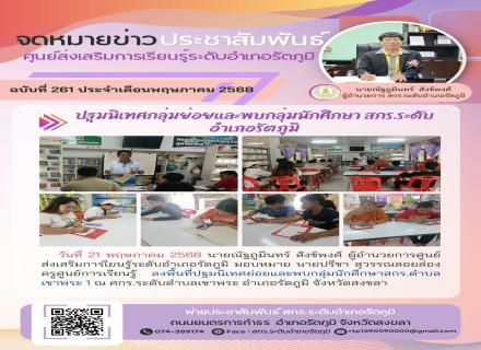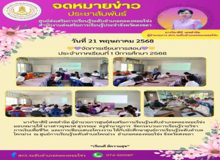วันพุธที่ 21 พฤษภาคม 2568 ดร.ไพโรจน์ คเชนทองสุวรรณ์ ผู้อำนวยการศูนย์ส่งเสริมการเรียนรู้ระดับอำเภอหาดใหญ่ มอบหมายให้ นางกนกนันท์ มัชรินทร์ ครูศูนย์การเรียนชุมชน พบกลุ่มนักศึกษา ศรช. สกร.ระดับอำเภอหาดใหญ่ |
