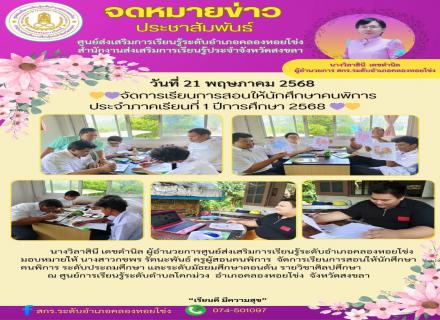 วันพุธที่ 21 พฤษภาคม 2568 ดร.ไพโรจน์ คเชนทองสุวรรณ์ ผู้อำนวยการศูนย์ส่งเสริมการเรียนรู้ระดับอำเภอหาดใหญ่ มอบหมายให้ นางสาวศศิธร กูลแก้ว ครูกลุ่มเป้าหมายพิเศษ พบกลุ่มนักศึกษาผู้พิการ |