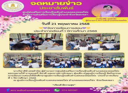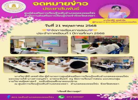 วันที่ 21 พฤษภาคม 2568 นางวิลาสินี เดชดำนิล ผู้อำนวยการศูนย์ส่งเสริมการเรียนรู้ระดับอำเภอคลองหอยโข่ง มอบหมายให้นางสาวยุพเรศ สุวรรณะ ครูชำนาญการ จัดกระบวนการเรียนรู้รายวิชาการเงินเพื่อชีวิต และการเขียนเสนอโครงงาน ให้กับนักศึกษาศูนย์การเรียนรู้ระดับตำ |