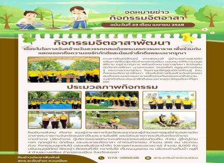 ร่วมกิจกรรมจิตอาสาพัฒนา เนื่องในโอกาสวันคล้ายวันสวรรคตสมเด็จพระนเรศวรมหาราช เพื่อร่วมกันแสดงออกถึงความจงรักภักดีและน้อมรำลึกถึงพระมหากรุณาธิคุณอันหาที่สุดมิได้ โดยมีนายสังคม เกิดก่อ รองผู้ว่าราชการจังหวัดสงขลา/รองผู้อำนวยการศูนย์อำนวยการจิตอาสาพระราชทานจั
