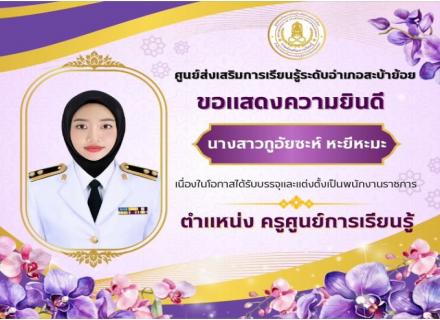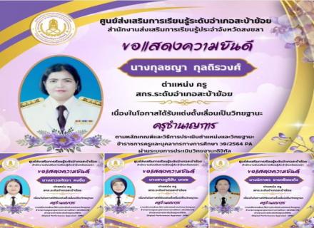 สกร.ระดับอำเภอสะบ้าย้อย 📌ขอแสดงความยินดีกับข้าราชการครู ได้แก่ นางกุลชญา กุลถิรวงศ์ นางสาวอภัตรา คงยิ้ม นางสาวนูรีฮัน มะแซ นางนิภาพร ชายเพ็ชรแก้ว เนื่องในโอกาสได้รับแต่งตั้งเลื่อนวิทยฐานะเป็น ครูชำนาญการ (คศ.2) ตามหลักเกณฑ์และวิธีการประเ