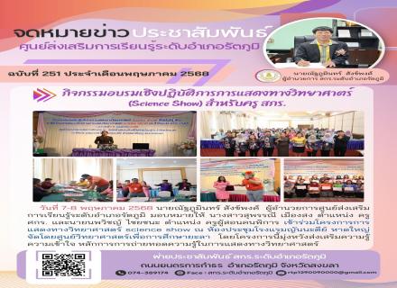 วันที่ 7-8 พฤษภาคม 2568 นายณัฐภูมินทร์ สังข์พงศ์ ผู้อำนวยการศูนย์ส่งเสริมการเรียนรู้ระดับอำเภอรัตภูมิ มอบหมายให้ นางสาวสุพรรณี เมืองสง ตำแหน่ง ครู ศกร. และนายนพวิชญ์ ไชยชนะ ตำแหน่ง ครูผู้สอนคนพิการ เข้าร่วมโครงการการแสดงทางวิทยาศาสตร์ science show ณ ห้อง |