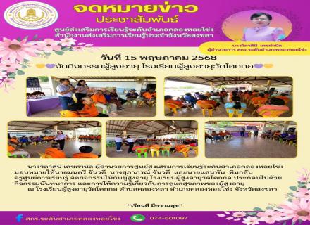 วันที่ 15 พฤษภาคม 2568 นางวิลาสินี เดชดำนิล ผู้อำนวยการศูนย์ส่งเสริมการเรียนรู้ระดับอำเภอคลองหอยโข่ง มอบหมายให้นายมนตรี จันวดี นางสุภาภรณ์ จันวดี และนายแสนพัน ทิมกลับ ครูศูนย์การเรียนรู้ จัดกิจกรรมให้กับผู้สูงอายุ โรงเรียนผู้สูงอายุวัดโคกกอ ป |