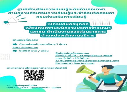 ศูนย์ส่งเสริมการเรียนรู้ระดับอำเภอเทพา รับสมัครบุคคล ตำแหน่งพนักงานบริการ