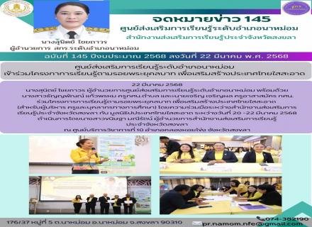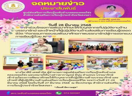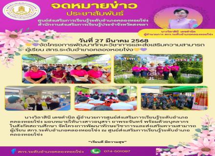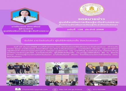 วันที่ 27 มีนาคม 2568 นางจีรวรรณ์ ปัตตะพัฒน์ ผู้อำนวยการศูนย์ส่งเสริมการเรียนรู้ระดับอำเภอจะนะ พร้อมด้วยนางณิชภัทร เปียเซ่ง ครูอาสาสมัครฯ ปฏิบัติหน้าที่กรรมการและเลขานุการ ศสปชต. ขุนตัดหวาย และนายวิศิษฐ์ เจะหมันประธาน ศสปชต.ขุนตัดหวาย เข้าร่วมรับโล่รา |
