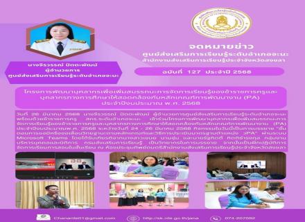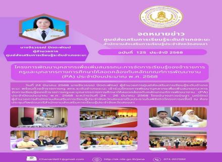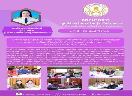 เมื่อวันที่ 20 มีนาคม พ.ศ.2568 นายณัฐภูมินทร์ สังข์พงศ์ ผู้อำนวยการศูนย์ส่งเสริมการเรียนรู้ระดับอำเภอรัตภูมิ มอบหมาย นางถอมพร อารมณ์เย็น ตำแหน่ง ครู ชำนาญการ, ว่าที่ร.ต.หญิงอังคณา กาญจนโรจน์ และนางปภาดา เตชะรัตน์ ตำแหน่ง ครูผู้สอนคนพิการ เข้า |