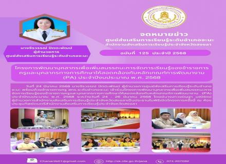 วันที่ 21 มีนาคม 2568 นางจีรวรรณ์ ปัตตะพัฒน์ ผู้อำนวยการศูนย์ส่งเสริมการเรียนรู้ระดับอำเภอจะนะ พร้อมด้วยคณะผู้อำนวยการสถานศึกษาในสังกัด เข้าร่วมการประชุมติดตามการขับเคลื่อนงานตามนโยบายของรัฐมนตรีว่าการกระทรวงศึกษาธิการ (พลตำรวจเอก เพิ่มพูน ชิดชอบ) ครั้งที |