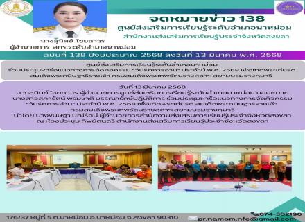วันที่ 13 มีนาคม 2568 นางชุติมา พูลเกิด ผู้อำนวยการศูนย์ส่งเสริมการเรียนรู้ระดับอำเภอบางกล่ำ มอบหมายให้ นางภัทรพร ศัทโธ ครูอาสาสมัครฯ เข้าร่วมประชุมเพื่อหารือแนวทางการจัดกิจกรรมสัปดาห์ส่งเสริมการอ่าน โดยมี นางสาวขนิษฐา มณีรัตน์ ผู้อำนวยการสำนักงานส่ง |