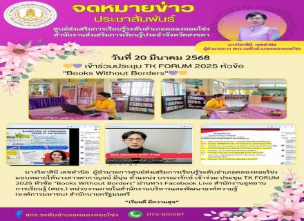 นางวิลาสินี เดชดำนิล ผู้อำนวยการศูนย์ส่งเสริมการเรียนรู้ระดับอำเภอคลองหอยโข่ง มอบหมายให้นางสาวตากาญจน์ มีนุ่น ตำแหน่ง บรรณารักษ์ เข้าร่วม ประชุม TK FORUM 2025 หัวข้อ \"Books Without Borders\" ผ่านทาง Facebook Live สำนักงานอุทยานการเรียนรู้ (สอร |