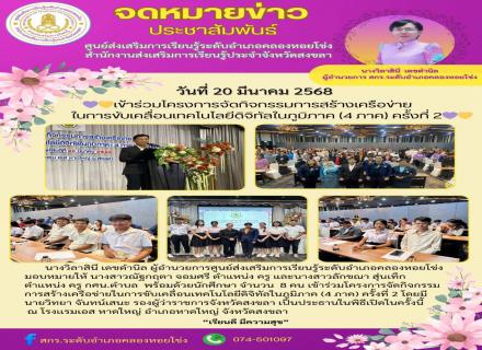 นางวิลาสินี เดชดำนิล ผู้อำนวยการศูนย์ส่งเสริมการเรียนรู้ระดับอำเภอคลองหอยโข่ง มอบหมายให้นางสาวตากาญจน์ มีนุ่น ตำแหน่ง บรรณารักษ์ พร้อมด้วยนางสาวกชพร รัตนะพันธ์ ครูผู้สอนคนพิการ จัดกิจกรรมส่งเสริมการเรียนรู้ตลอดชีวิต กิจกรรมส่งเสริมการเรียนรู้วรรณกรรมชุม |