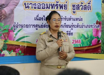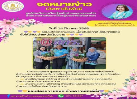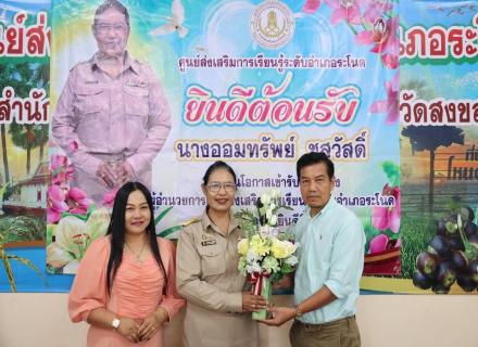 นางสาวยุพเรศ สุวรรณะ ครูชำนาญการ รักษาการในตำแหน่งผู้อำนวยการศูนย์ส่งเสริมการเรียนรู้ระดับอำเภอคลองหอยโข่ง พร้อมด้วยคณะบุคลากร ร่วมแสดงความยินดีกับ นายอิสมาแอล ถวิดีกุล ดำรงตำแหน่งผู้อำนวยการ สกร.ระดับอำเภอจะแนะ จังหวัดนราธิวาส นางอาแอเสาะ |