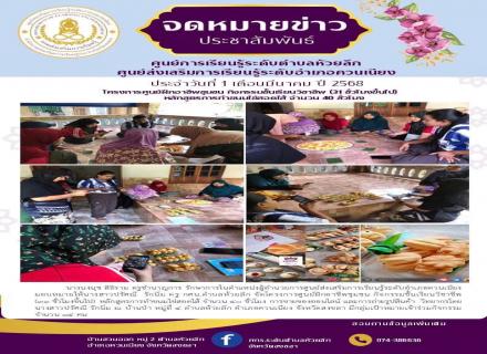 18 กุมภาพันธ์ 2568 นางจีรวรรณ์ ปัตตะพัฒน์ ผู้อำนวยการ ผู้อำนวยการศูนย์ส่งเสริมการเรียนรู้ระดับอำเภอจะนะ พร้อมด้วยนายมู่หำหมัด บินล่าเต๊ะ ครูชำนาญการพิเศษ นางสาวกิ่งกาญจน์ ฤทธิ์ทอง ครู และคณะครู ศกร.ระดับตำบลจะโหนง เข้าร่วมโครงการกินน้ำชายามเช้า กินข้าวยำส |