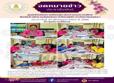 เมื่อวันที่ 25 กุมภาพันธ์ 2568 นางนงนุช สิธิราม ครูชำนาญการ รักษาการในตำแหน่ง ผู้อำนวยการศูนย์ส่งเสริมการเรียนรู้ระดับอำเภอควนเนียง พร้อมด้วยคณะครูและบุคลการ ศูนย์ส่งเสริมการเรียนรู้ระดับอำเภอควนเนียง ร่วมประชุมประจำสัปดาห์ |