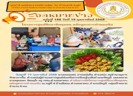 วันพุธที่ 19 กุมภาพันธ์ 2568 นางถนอมพร อารมณ์เย็น ตำแหน่ง ครูชำนาญการ รักษาการใน ตำแหน่งผู้อำนวยการศูนย์ส่งเสริมการเรียนรู้ระดับอำเภอรัตภูมิ มอบหมาย นายพุทธพร รัตนอุไร ครู กศน.ตำบลเขาพระ ดำเนินการจัดโครงการศูนย์ฝึกอาชีพชุมชน หลักสูตรการทำขนมจีบ ณ หมู่ที่ |