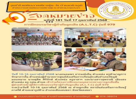 เมื่อวันที่ 10-16 กุมภาพันธ์ 2568 นางถนอมพร อารมณ์เย็น ตำแหน่ง ครูชำนาญการ รักษาการใน ตำแหน่งผู้อำนวยการศูนย์ส่งเสริมการเรียนรู้ระดับอำเภอรัตภูมิ มอบหมาย นายดุสิต ศิริรักษ์ ตำแหน่ง ครูอาสาฯ และนางสาวสุพรรณี เมืองสง ตำแหน่ง ครู กศน.ตำบล เข้าร่วมโครงการฝึก |