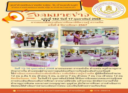 เมื่อวันที่ 15-16 กุมภาพันธ์ 2568 นางถนอมพร อารมณ์เย็น ตำแหน่ง ครูชำนาญการ รักษาการใน ตำแหน่งผู้อำนวยการศูนย์ส่งเสริมการเรียนรู้ระดับอำเภอรัตภูมิ ได้ดำเนินการสอบเทียบระดับนักศึกษา ระดับมิติความรู้ความคิด ผู้มีสิทธิ์สอบจำนวน 12 คน ม.ต้น 5 คน เข้าสอบ 5 คน, |