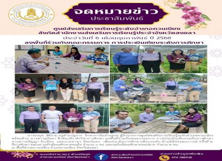 เมื่อวันที่ 6 กุมภาพันธ์ 2568 นางนงนุช สิธิราม ครูชำนาญการ รักษาการในตำแหน่ง ผู้อำนวยการศูนย์ส่งเสริมการเรียนรู้ระดับอำเภอควนเนียง พร้อมด้วย นางสาวสุกัลยา ซิวอินเห้ง นักวิชาการศึกษา ลงพื้นที่ร่วมกับคณะกรรมการ การประเมินเทียบระดับการศึกษา นางสาวอรัญญา ร |