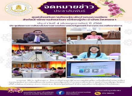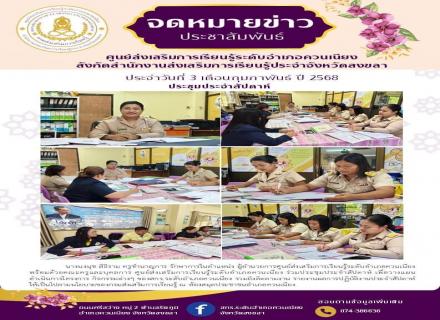 เมื่อวันที่ 3 กุมภาพันธ์ 2568 นางนงนุช สิธิราม ครูชำนาญการ รักษาการในตำแหน่ง ผู้อำนวยการศูนย์ส่งเสริมการเรียนรู้ระดับอำเภอควนเนียง พร้อมด้วยคณะครูและบุคลการ ศูนย์ส่งเสริมการเรียนรู้ระดับอำเภอควนเนียง ร่วมประชุมประจำสัปดาห์ |
