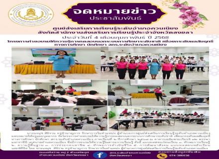 เมื่อวันที่ 11 กุมภาพันธ์ 2568 นางนงนุช สิธิราม ครูชำนาญการ รักษาการในตำแหน่ง ผู้อำนวยการศูนย์ส่งเสริมการเรียนรู้ระดับอำเภอควนเนียง มอบหมายให้ครูและบุคลากร ศูนย์ส่งเสริมการเรียนรู้ระดับอำเภอควนเนียง จัดกิจกรรมการแข่งขันเปิดสารานุกรมไทยสำหรับเยาวชน ฯ |