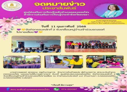 วันที่ 11 กุมภาพันธ์ 2568 นางสาวยุพเรศ สุวรรณะ ครูชำนาญการ รักษาการในตำแหน่ง ผู้อำนวยการ สกร.ระดับอำเภอคลองหอยโข่ง มอบหมาย ให้นางสุภาภรณ์ จันวดี ศูนย์ศส.ปชต.คลองหอยโข่ง จัดกิจกรรมหลักที่ 2 ขับเคลื่อนหมู่บ้านเข้าร่วมรณรงค์ไม่ขายเสียง ณ ศาลาเอ |