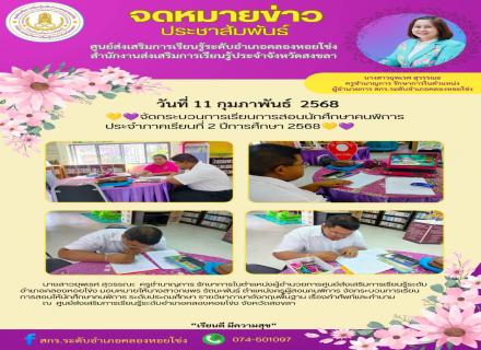 วันที่ 11 กุมภาพันธ์ 2568 นางสาวยุพเรศ สุวรรณะ ครูชำนาญการ รักษาการในตำแหน่งผู้อำนวยการศูนย์ส่งเสริมการเรียนรู้ระดับอำเภอคลองหอยโข่ง มอบหมายให้นางสาวกชพร รัตนะพันธ์ ตำแหน่งครูผู้สอนคนพิการ จัดกระบวนการเรียนการสอนให้นักศึกษาคนพิการระดับประถมศึกษ |