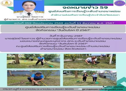 วันที่ 11 ธันวาคม 2567 นางสุนิตย์ ไชยถาวร ผู้อำนวยการศูนย์ส่งเสริมการเรียนรู้ระดับอำเภอนาหม่อม มอบหมายคณะครูเเละบุคลากร สกร.ระดับอำเภอนาหม่อม จัดกิจกรรม \"วันดินโลก ปี 2567\" ณ ศูนย์ส่งเสริมการเรียนรู้ระดับอำเภอนาหม่อม ตำบลนาหม่อม |