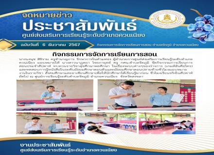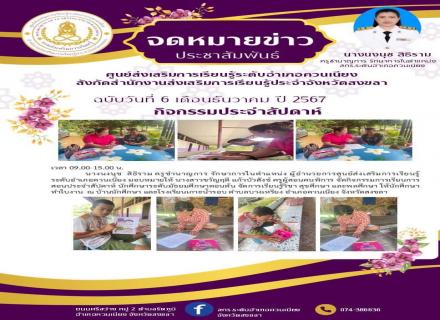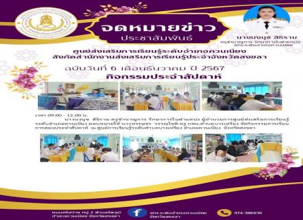 วันที่ 6 เดือนธันวาคม 2567 เวลา 09.00 - 12.00 น. นางนงนุช สิธิราม ครูชำนาญการ รักษาการในตำแหน่ง ผู้อำนวยการศูนย์ส่งเสริมการเรียนรู้ระดับอำเภอควนเนียง มอบหมายให้ นางหรรษธร วรรณโชติ ครู กศน.ตำบลบางเหรียง จัดกิจกรรมการเรียนการสอนประจำสัปดาห์ ณ ศูนย์การเรี