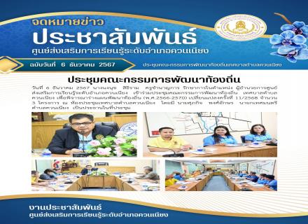 วันที่ 6 ธันวาคม 2567 นางนงนุช สิธิราม ครูชำนาญการ รักษาการในตำแหน่ง ผู้อำนวยการศูนย์ส่งเสริมการเรียนรู้ระดับอำเภอควนเนียง เข้าร่วมประชุมคณะกรรมการพัฒนาท้องถิ่น เทศบาลตำบลควนเนียง เพื่อพิจารณาร่างแผนพัฒนาท้องถิ่น (พ.ศ. 2566-2570) เปลี่ยนแปลงครั้งที่ 11/