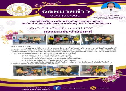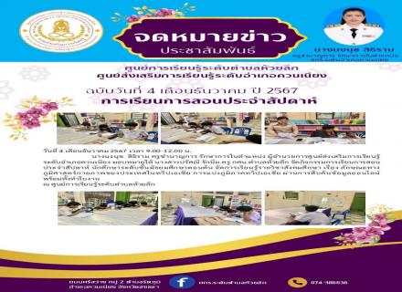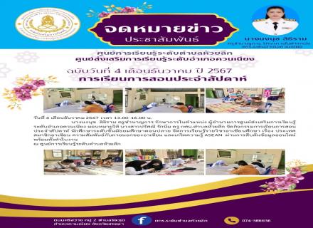 วันที่ 4 เดือนธันวาคม 2567 เวลา 9.00-12.00 น. นางนงนุช สิธิราม ครูชำนาญการ รักษาการในตำแหน่ง ผู้อำนวยการศูนย์ส่งเสริมการเรียนรู้ระดับอำเภอควนเนียง มอบหมายให้ นางสาวปรัศณี รักนิ่ม ครู กศน.ตำบลห้วยลึก จัดกิจกรรมการเรียนการสอนประจำสัปดาห์ นักศึกษาระดับชั้