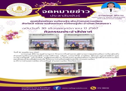 วันที่ 30 พฤศจิกายน 2567 นางนงนุช สิธิราม ครูชำนาญการ รักษาการในตำแหน่ง ผู้อำนวยการศูนย์ส่งเสริมการเรียนรู้ระดับอำเภอควนเนียง มอบหมายให้ นางสาวศริวรรณ กลับคง บรรณารักษ์ นายนิคม ศรีวะปะ ครูอาสาสมัครฯ และ นางสาวขวัญฤดี แก้วบัวสังข์ ครูผู้สอนคนพิการ เ