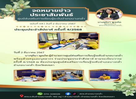 วันที่ 2 ธันวาคม 2567 นางชุติมา พูลเกิด ผู้อำนวยการศูนย์ส่งเสริมการเรียนรู้ระดับอำเภอบางกล่ำ พร้อมด้วยครูและบุคลากร ร่วมประชุมประจำสัปดาห์ ตามระเบียบวาระครั้งที่ 4/2568 ณ ห้องประชุมศูนย์ส่งเสริมการเรียนรู้ระดับอำเภอบางกล่ำ อ.บางกล่ำ จ.สงขลา