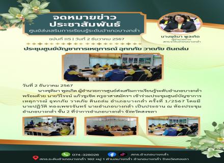 วันที่ 2 ธันวาคม 2567 นางชุติมา พูลเกิด ผู้อำนวยการศูนย์ส่งเสริมการเรียนรู้ระดับอำเภอบางกล่ำ พร้อมด้วย นายวิโรจน์ แก้วชูเชิด ครูอาสาสมัครฯ เข้าร่วมประชุมศูนย์บัญชาการเหตุการณ์ อุทกภัย วาตภัย ดินถล่ม อำเภอบางกล่ำ ครั้งที่ 1/2567 โดยมีนายปฏิวัติ ทองเพชรจันท