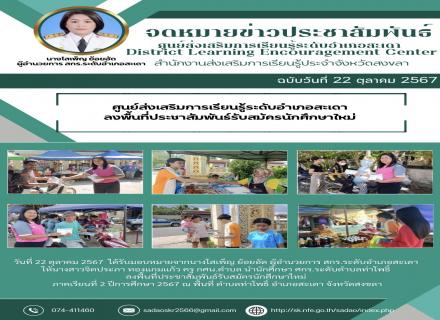 วันที่ 24 ตุลาคม 2567 นางสาวยุพเรศ สุวรรณะ ครู คศ.2 รักษาการในตำแหน่งผู้อำนวยการศูนย์ส่งเสริมการเรียนรู้ระดับอำเภอคลองหอยโข่ง พร้อมด้วยคณะบุคลากรร่วมต้อนรับ นางสาวขนิษฐา มณีรัตน์ เนื่องในโอกาสย้ายมาดำรงตำแหน่งผู้อำนวยการสำนักงานส่งเสริมการเรียนรู้ |